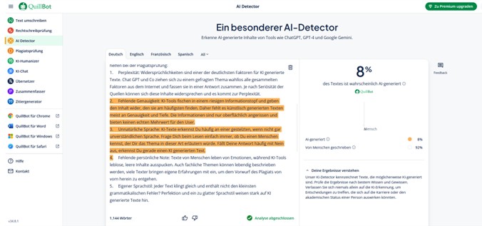 Bei diesem KI-Detektor ging ich schon wesentlich skeptischer an die Sache heran. Der Grund: Neben der Erkennung von KI generierten Texten bietet er auch selbst KI-Textgeneratoren an und Überraschung: als ich meinen Text (denselben wie im vorigen Test) ins Tool warf, war er plötzlich zu 8 Prozent von Ki generiert (siehe Abbildung)