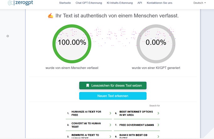 Auch diese KI Checker hat mich bei der Texterkennung dieses Beitrags positiv überrascht und bekommt von mir eine eins mit Sternchen. Wenn alle kostenlosen Tools so zuverlässig arbeiten würden wie Zerogpt, hätte ich tatsächlich in Zukunft keine Probleme mehr, wenn meine Kunden jeden meiner Sätze überprüfen würden.